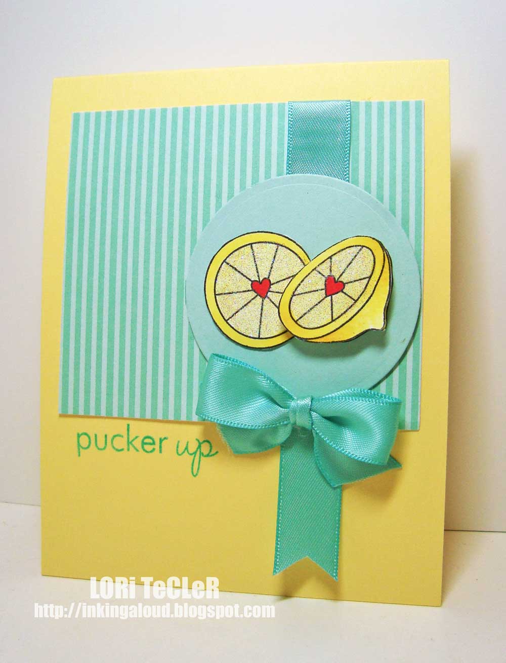 The rest of the card's pretty simple. I layered the lemon image on an aqua circle and set it on a piece of striped Aqua Mist paper. The image's accented with a piece of darker aqua blue satin ribbon. The set's "pucker up" sentiment is stamped in Hawaiian Shores ink just underneath the patterned paper panel. I was worried that the ink would look too green after stamping it on the Lemon Tart card base, but I think it stayed fairly true to color.