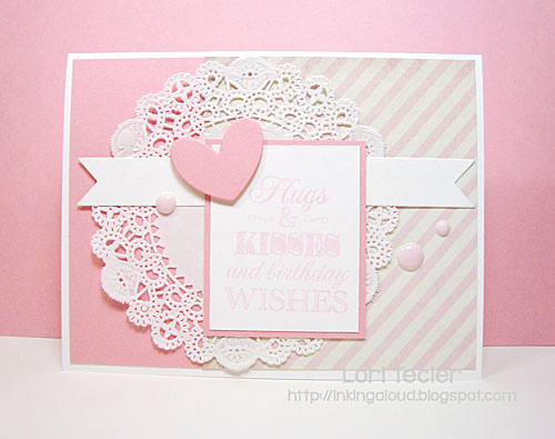 Cake Decorating Extras stamp set, I’m a Princess Pink and A Blanc Check cardstock, Hearts Plus and Favor Flags dies (Clear and Simple Stamps); Memento Luxe Angel Pink ink (Tsukineko); Love Note 6x6 paper pad (Fancy Pants); pink enamel dots (Prima); white paper doily; foam tape