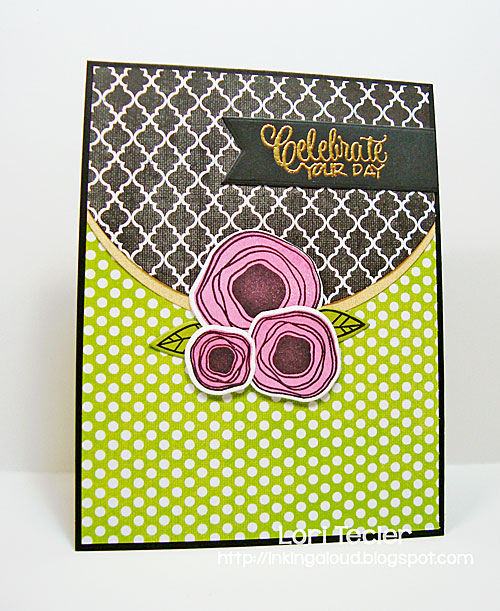 I covered the bottom of a black card base with a piece of green dotted patterned paper, then layered a piece of black patterned paper with a curved edge at the top. The edge of the black patterned paper is matted in gold to set it off nicely from the green panel. I arranged the flowers along the curved edge, using foam tape to adhere the two smaller flowers for dimension. The “celebrate your day” sentiment was stamped on a banner strip and heat embossed in gold embossing powder for a nice, bold pop against the black background. I wanted to add a few gold sequins, but I resisted! Instead, I tucked a pair of leaves in among the flower trio.